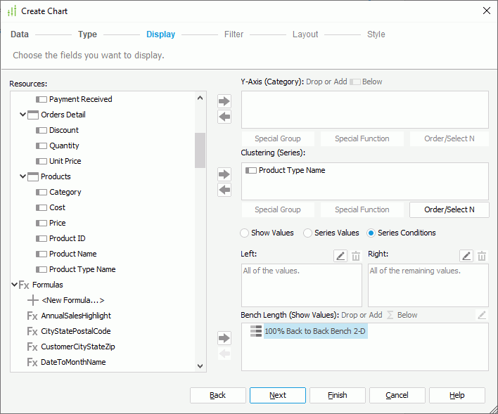 When you define how the comparison on the value axis of a back-to-back bench chart is created, you can either add two values on the origin left and origin right of the value axis to compare if it is a 2-D chart, or make the comparison based on the series field values if the chart contains a series field. When the comparison is based on series values, you need to further define the series values to display on the origin left and origin right of the value axis: either manually or use a condition.