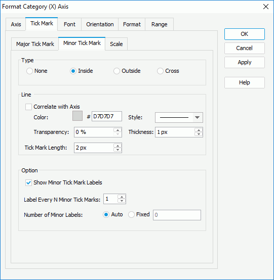 - In the Tick Mark tab, select the Minor Tick Mark subtab, select Inside in the Type box to show the minor tick marks inside the axis, and then select Show Minor Tick Mark Labels in the Option box to show the minor tick mark labels.