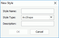 - Specify the name, type, and description of the new style, then select OK. The style type indicates the application scope of a style, for example, you can apply a style of the "Label" type to label objects, and a style of the "DBField" type to DBFields.