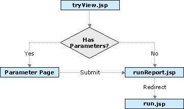 This JSP functions the same as tryView.jsp when the report has no parameters. When it has parameters, Server runs the report with the default parameter values if you specify no parameter values, or else it runs with the parameter values you specified in the URL.